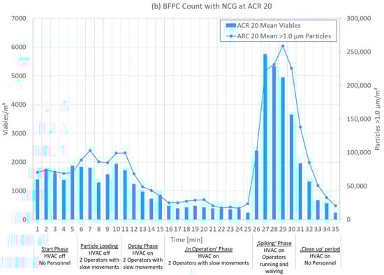 Particles and Viables/m3 in the different test phases at ACR 20: (a) with I8G/(b) with NCG (Note the different scale on x-axes in (b) to reflect the spiking phase).
