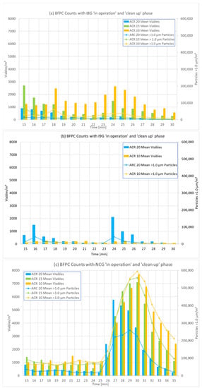 Particle and Viable/m3 results at different ACRs: (a) with I8G/(b) with I9G/5c with NCG (Please note the different scale on x-axes in Figure (c) to reflect the ‘spiking phase’).