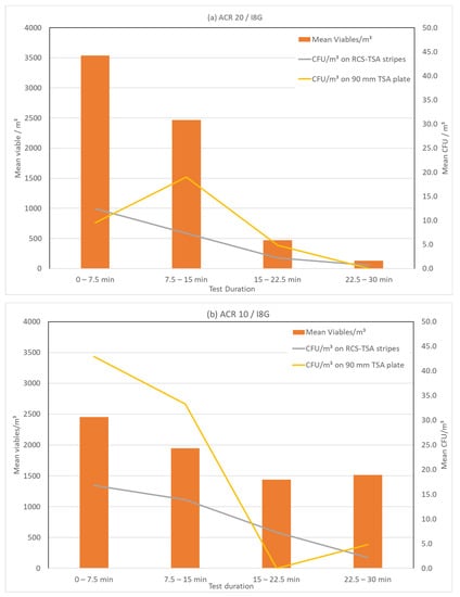As expected, the numbers of MCPs detected by the BFPC were much higher than the culturable microbes counted on the agar plates and strips. Figure 6 compares both values for I8G with ACR 20 and ACR 10 (Cf. Supplementary Material for more detailed diagrams). To illustrate this comparison a factor of 80 had to be chosen between the CFU/m3 and the viable/m3 axis. Still, it was noticeable that all values decreased during the test runs, and that the clean-up capability of ACR 20 was higher than that of ACR 10, as the measured values in the second half of the experiments were lower.
