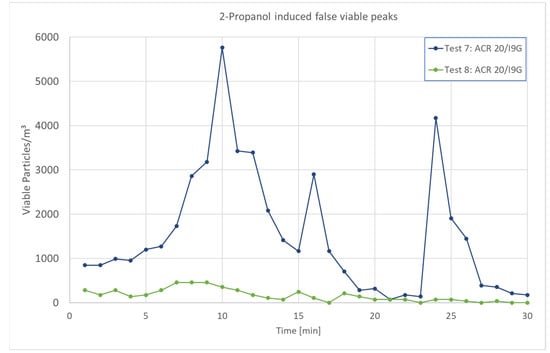 The effect of induced peaks by use of a 2-propanol spray bottle for hand disinfection is visible in Figure 7. The peaks occurred only in the first of the two test runs with I9G at ACR 20. The comparison of particles and viables at these peak times, at first sight led to the assumption of operator activity, which released a high load of MCPs, and which was subsequently detected by the particle counter as well as by the BFPC. However, this would also have become visible as increased CFUs, although a related increase in CFUs could not be found either on RCS-strips or on agar-plates. By reviewing the recorded videos, the cause of the peaks could be traced back to the use of the 2-propanol spray bottles, which was also observed in other studies [,,]. Once observed, the use of disinfection spray was stopped after test 7.