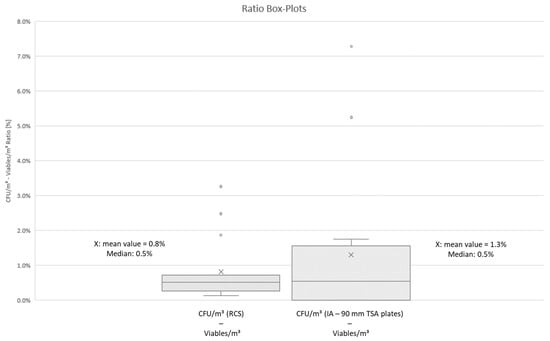 In Figure 8, the ratio of CFUs/m3 to viables/m3 wearing pharmaceutical garments at the highest (ACR 20) and lowest (ACR 10) airflow are shown. The values of both MAS systems correlate (Spearman’s ρ: 0.55/p = 0.027). For CFUs vs. viables the median value was at the same level for RCS and IA (0.5%). The distribution for IA with 90 mm agar plates was higher due to a leveraging effect caused by the low sampling volume and short runtime per plate (cf. Section 4 for discussion of this effect).