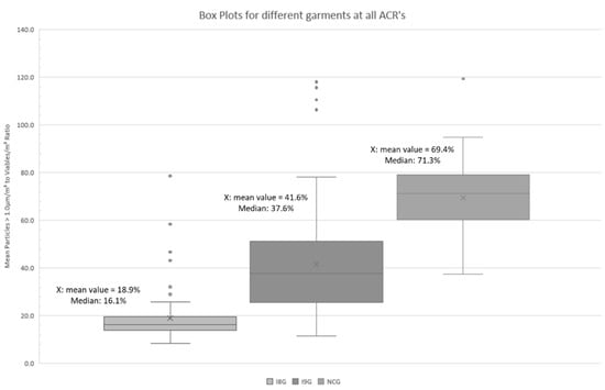 The distribution of particles/viables ‘in operation’ values for the three different garments is presented in Figure 9. It is clearly detectable that the mean and median values differed between the type of garments. A correlation between the different garments is not given. Furthermore, the distribution of values was higher with I9G and NCG.