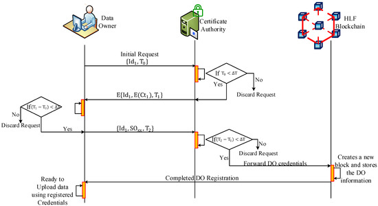 - Let be a DO. It initially sends a request to the CA with the unique identity and timestamp. The registration of the DO is , where is the owner’s identity, denotes the first request from the DO, and is the initial timestamp.