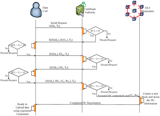 - Data User: The data user also registers with the certificate authority and then submits an access request to the Hyperledger Fabric blockchain. The DUs are n in total number, and they are denoted as . The DUs are the mobile devices that submit the query and receive the required response from the cloud. The data user’s credentials are validated and the access policy is validated.