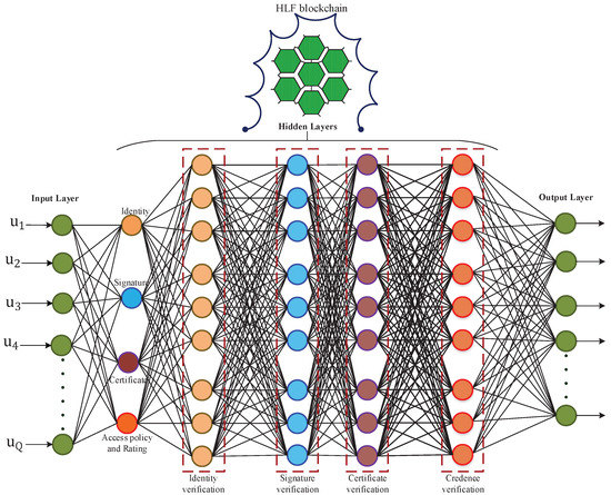 - Layer 1: Input LayerThis is the first layer of the ANN that receives the DU requests along with the identity, signature, certificate, successful access to policy and rating value. The entity’s identity, signature and certificate are in hash values. The input security credentials are independent variables; hence they are to be validated individually.