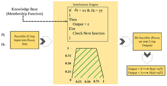 - Interference Engine: This engine is responsible for decision making, and the process takes place based on the generated IF–THEN rules. A knowledge base is connected to an interference engine which consists of a set of defined rules based on the considered set of inputs.Table 1 depicts the input and its corresponding output. The fuzzy sets are operated using the membership function that is represented as . The X is the input that maps towards the membership function, and F is the fuzzy set. The term represents the number of selected attributes, and is the total number of attributes. The input follows the result as per the rule and gives the output to the next block.
