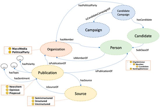 According to the main concepts listed above, the ontology development process was started with a top-down approach to present and define the hierarchy of classes, subclasses, and object properties more easily. The ontology has been defined in OWL2 [61] using Protégé (https://protege.stanford.edu/ (accessed on 12 August 2022)). It contains seven main concepts: Campaign, Candidate, CandidateCampaign, Organization, Person, Publication, and Source. There are also other related concepts to cover the aims suggested in political marketing. These main concepts directly impact the research questions and can be defined as follows: