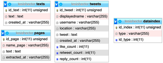 All the raw data obtained from the considered sources is inserted into an intermediary relational database with a structure compatible with the information required to populate the PMont ontology classes. Figure 3 shows the tables created in an MySQL database, which presents tweets, pages, and texts as source types, and an index table used as the IDs dictionary. The data retrieved from the sources is thus separated from the information produced in later stages of the framework process pipeline. That is, the results of the data analysis process using NLP, NER, relation extraction, or classification techniques and tools as described in the next section are not included in the database but otherwise managed in-memory to enable further processing.
