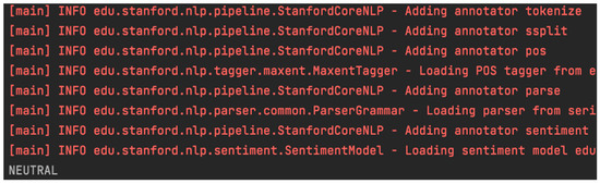 - Finally, sentiment analysis is applied with the Standford CoreNLP library obtaining three possible values: positive, neutral, or negative. For the text presented above, the content analysis result is “neutral” (see Figure 6).