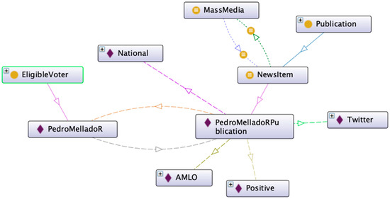 Finally, the KG is presented as a representation of the recently populated ontology (knowledge base). Visually, the KG generated could be presented using tools such as OntoGraph (https://github.com/NinePts/OntoGraph (accessed on 12 August 2022)), WebVOWL (https://service.tib.eu/webvowl/ (accessed on 12 August 2022)), and OVisualizer (https://github.com/yWorks/ontology-visualizer (accessed on 12 August 2022)). The new instances are inserted in the PMont and later can be visualized through a graph representation (see Figure 7). The resulting populated ontology is publicly available at https://github.com/hectorguedea/pmont (accessed on 12 August 2022).