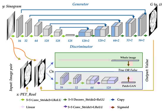 Unlike traditional generative adversarial networks (GANs) [37], in which the only input is noise z, cGANs can provide extra information y to lead the training of the network. In this work, the input data include both noise z and sinogram data y. The cGANs consist of two models: generator G and discriminator D. The generator adapts the U-net architecture [38], which generates the PET image directly from a sinogram image. The full-image strategy is introduced to the discriminator, which attempts to differentiate between the real sinogram and PET image pairs from the database and the fake image pair output generated by G. The entire framework involves training G and D alternately until a balance is reached in the convergence stage. Figure 1 illustrates the structure of the entire reconstruction network. In the discriminator part, both the whole-image strategy and Patch-GAN strategy are utilized.