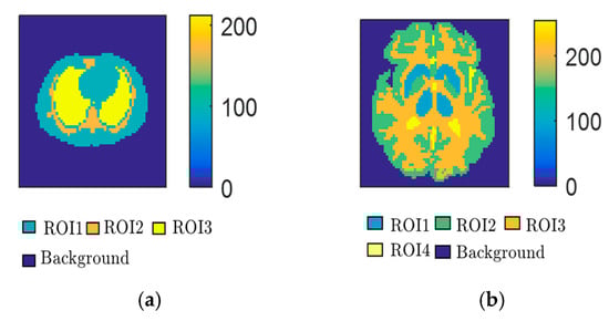 Simulated data of the Zubal thorax phantom with 64Cu-ATSM and Zubal brain phantom with 11C-Acetate were generated using Monte Carlo simulations, which can simulate the true environment of the PET scan and generate realistic sinogram data by using the GATE toolbox. The simulated PET scanner adopted was the Hamamatsu SHR74000, which contains six rings with 48 detector blocks. The ring diameter is 826 mm. The size of the field of view is 576 mm in the transaxial direction and 18 mm in the axial direction [39]. To obtain the original PET data for the Monte Carlo simulation, a two-compartment model was used to simulate the radiation concentration of different regions of interest (ROIs) in different phantoms. Figure 4 shows that each phantom is composed of several ROIs, in which the kinetic parameters of the two-compartment model are different. Details regarding the kinetic parameter settings can be found in the literature [40,41,42]. Each phantom consisted of three data sampling times. For each sampling time, three levels of counting rates were set: 5 × 106, 1 × 107, and 5 × 107. For different counts, each reconstructed dynamic image had 18 frames with a resolution of 64 × 64 pixels. Thus, the entire database consisted of two phantoms, and each phantom dataset contained 162 (9 × 18) images. One third of each phantom dataset was randomly selected as the testing set, which included 162 images, with the others making up the training set, which included 324 images. The detailed sampling interval of the 18 frames is shown in Table 1. For example, for the 20 min simulated scanning of the Zubal thorax phantom, the first 14 frames were taken every 50 s, then two frames were taken every 100 s, and the last two frames were taken every 150 s.