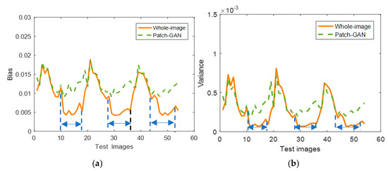 The full-image discriminator and Patch-GAN discriminator were both tested on the Zubal thorax dataset. Three dynamic objects were used to test, and each object possesses 18 frames. As we know, during the scanning period, with the increase in tracer injection time, the more photons the organ accumulates, the clearer the active image. In the current clinical practice, doctors usually pay attention to the static data, one clear active image of the later frames. Thus, the later frames are much useful for clinical. We compared the two strategies with the dynamic testing data and the results are shown in Figure 5. Though we obtained approximate quantitative results in the first 10 frames of the two strategies, the latter 8 frames of the whole-image strategy obtained much lower bias and variance compared to Patch-GAN. It is obvious that with the whole-image discriminator helping, the proposed network has better ability in improving the reconstruction image quality, especially for the frames with higher numbers of photons.