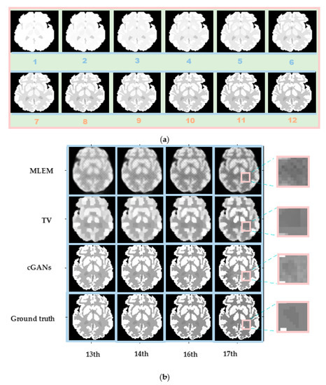Robustness verification graphs of Zubal head phantom for different frames. (a) Concentration distribution of training images (the first 12 frames). (b) Reconstruction results for Zubal head phantom with a 70 min scan and 5 × 107 counts. From top to bottom: MLEM results, TV results, cGAN results, and ground truth. From left to right: the 13th, 14th, 16th, and 17th frames.