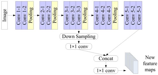 When an image is processed in VGG-16, the feature maps generated by the convolution layers will be reduced by max-pooling layers. The last feature maps might have insufficient information for the detection of very small objects, such as platelets. However, the feature maps generated in the middle layers still have abundant information. We adopted the feature fusion method to yield additional feature maps [,]. Feature fusion includes three kinds of approaches: feature ranking, feature extraction, and feature combination. Here feature combination was adopted, and the process is illustrated in Figure 2. The feature maps generated by convolution layers Conv 3-3 and Conv 5-3 were combined to provide information in higher resolution.