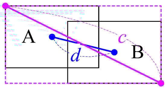 In addition, we measured the Distance-IoU (DIoU) [] of the predicted box and ground truth box. The computation of DIoU is shown by Equation (2), where d is the Euclidean distance between the central points of the two overlapping boxes, and c is the diagonal length of the smallest rectangle covering the two boxes, as shown in Figure 4.