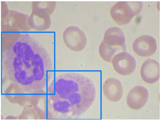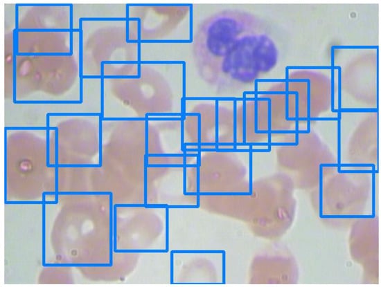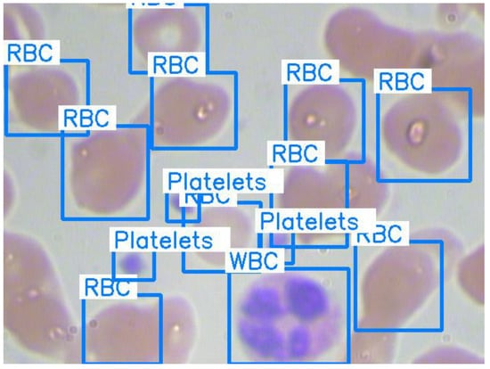 The Blood Cell Count and Detection (BCCD) dataset [] is used in this research. It is a public dataset of annotated blood smear images for blood cell detection. It consists of 364 blood smear images with 640 × 480 pixels and an annotation file for details on the image. Each image involves arbitrary numbers of RBCs, WBCs, and platelets. The annotation file contains the information related to annotated blood cells, e.g., the coordinates of bounding boxes and categories. Figure 5 shows one of the blood smear images in the dataset with bounding boxes and labeled blood cells.