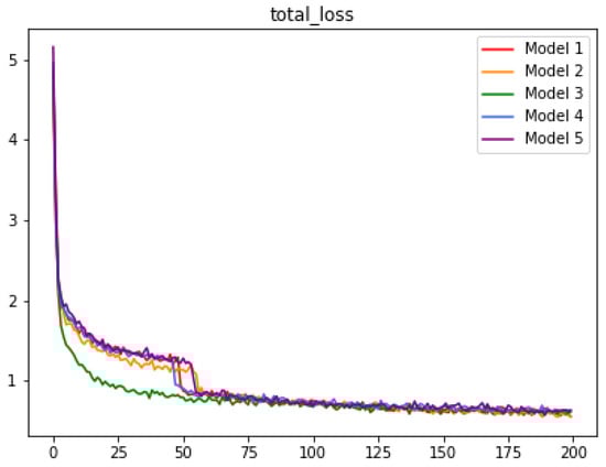 Figure 6 shows the total training loss of all of the models. The loss might be relevant to the size of the input image. Model 2 is trained with enlarged images and achieves higher measurement indices for RBC recognition tasks. Since RBCs are the majority of the BCCD dataset, the total training loss is quickly reduced at the beginning of the epoch time.