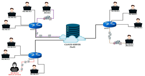 A cloud architecture will consist of different routers, users, and a cloud server. First, three different routers will be taken in this architecture, and different users will be connected to these routers. The IP address of each router will be different from the other router, and the IP address of each user will be different from all the users of the other router, as shown in Figure 3. First, from IP address 192.168.10.4, a text file will be encrypted via Router 10.0.0.1 and transmitted to the cloud server (SaaS). Every user will access the file when the file will be transmitted to the cloud server. This file will have to be decrypted whenever a valid user has to access this file. Suppose an attacker tries to make a Replay Attack on a file in which he uploads the file to the cloud server by creating his file or modifying a valid user’s file. In that case, the exact decryption mechanism will have to be implemented, which will be made for valid users. In Figure 4, a valid user encrypted a file and uploaded it to a cloud server (SaaS), and as soon as the file was uploaded, the attacker, whose IP address is 192.168.15.3, downloaded the file to that IP address and changed the cipher values in that file, and re-uploaded it to the cloud server with the same name. When two files of the same name will be received on the receiver side or the original file will be replaced, it will be difficult for the receiver to differentiate between them, which is a big problem. This problem will be solved by a mechanism discussed in Figure 4.