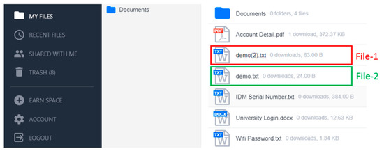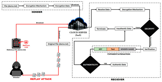 First, a plain text file “demo. txt” will be taken on the sender side, the encryption mechanism will be applied to that file, and the encrypted text will be obtained, and then this file will be transmitted to the cloud server as shown in Figure 4. The “demo. text” file was broadcast over the entire cloud network when uploaded to the cloud server. This file was received by an attacker who wanted to use the sender data, but because of the cipher text, the attacker made some changes to this file and re-uploaded it to the cloud server as an authentic user. Now, when the receiver accesses this file, that file can be authentic or inauthentic. When the receiver implements the decryption mechanism on the file, if there are any new cipher values other than the defined cipher values used in the encryption algorithm, the decryption mechanism will not work on such data, and it will be considered inauthentic data. If data is successfully decrypted, then this file will be verified. The cipher catenation will be used for file verification. In cipher-catenation, the Key will be added at the beginning of the text, and the username will be added at the end of the text. The receiver will first check the Key as to whether it is valid or invalid. It will then check the sender’s name to see if the name of the file sender is correct or not. The attacker cannot decrypt the cipher text, but he can make changes to it. In case of changes, the original and malicious data will be identified in the verification step. This is an efficient way to detect replay attacks and prevent data from being tampered with.