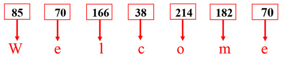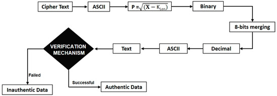 In Algorithm 2, to decrypt the data, first, the cipher text will be converted to ASCII and then on the derived ASCII values “” formula will be implemented, and obtained decimal values will be converted to binary, as shown in Figure 7. These binary values will then be converted to decimal by making pairs of 8-bits. When different decimal values are obtained, then these decimal values will be converted to ASCII to get a text. After receiving the text, a verification mechanism will be applied to the text based on which the authentication of the data will be checked, as shown in Figure 4.
