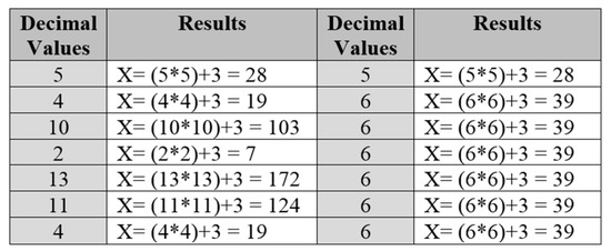 Step-6: After converting binary to decimal “: X = (C*C) + Klen” formula has been used, on each decimal value, this formula has been implemented, and different results have been obtained, as shown in Figure 15. Klen means the length of the Key received from the receiver. In this paper, “Ali” is taken as a key from the receiver whose length is 3, so Klen = 3.