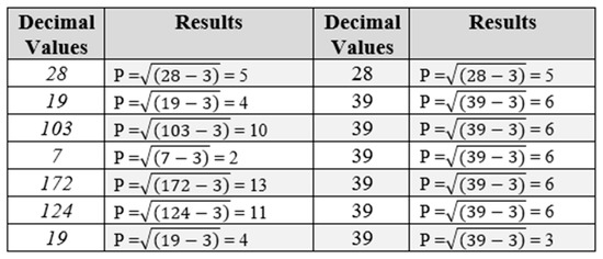 Step-3: After obtaining different ASCII values, “P = ” formula has been implemented on decimal values, and different results have been obtained, as shown in Figure 20.