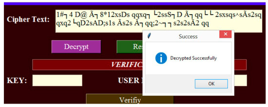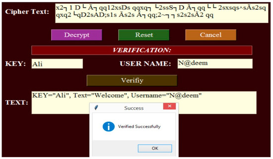 When the text was successfully decrypted, the authenticity of the cipher text was verified using the Key and Username, as shown in Figure 29.