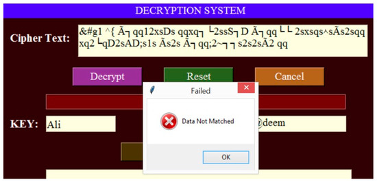 First, a plain text “Welcome” has been taken, and this plain text has been encrypted with username “N@deem” and key “Ali”. After encrypting the data, a cipher value has been obtained, as shown in Figure 8.