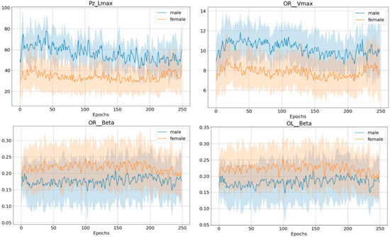 The difference between the average features of all male and all female drowsy drivers: Vmax from the OR region, Lmax from the Pz channel, relative beta power from the OR region, and relative beta power from the OL region. The Y-axis shows the values of observed features. The bold line is the mean of the feature, and the filled area represents the standard deviation.