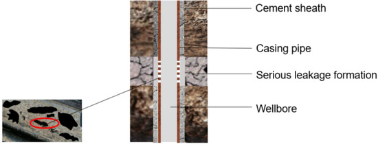 With the deepening exploration and development of oilfields, the contradiction between wellbore technology and production is increasingly prominent. First, the prolonged use of casing causes serious aging. In addition, the casing undergoes severe corrosion under the influence of downhole factor interactions, and the factors include high temperature, high pressure, high salinity and so on. The above two points cause corrosion perforation and leakage of casing [1,2,3,4,5]. Figure 1 shows the corrosion perforation and leakage of the casing caused by the above two points, which causes a single well to produce only water but not oil. There are a total of 43 wells with this problem, accounting for nearly 7% of normal wells. Second, because the profile of the oil well is unevenly utilized and the medium and the weak water-flooded layer was not effectively used, it is necessary to strongly plug the water-flooded layer to realize fine digging of the remaining oil [6,7]. Third, the unbalance of ground stress is caused by the action of formation, which causes extrusion load to the outer wall of the casing. The large stratigraphic dip produces uneven squeezing and dislocation load to the outer wall of the casing. At the same time, follow-up stimulation treatment and fracturing operations exacerbate stratigraphic dislocation. These factors lead to deformation and fracture of the casing [8,9,10,11]. Fourth, mechanical damage to the casing is caused during casing running because of the deviation existing between the well inclination angle, azimuth angle and operational requirements for the bending section of the casing and rough/poor construction quality of well cementation, which leads to casing failure [12,13]. Fifth, the span of the oil layer is large, and it is difficult to reconstruct the lower formation, for which reason the lower formation cannot be effectively used. Therefore, in order to meet the requirements of long-term production and subsequent fracturing, it is necessary to plug wells with casing damage, such as corrosion perforation, casing deformation and casing faults, and wells with outside casing channeling and interlayer channeling [14,15,16,17,18] as shown in Figure 2. How to effectively and successfully plug a well with damaged casing and leakage formation to increase single well production is still an urgent problem to be solved in the process of oilfield development.