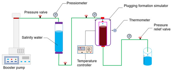 - The steel pipe was fixed with a core holder, and a sand control net was placed at the bottom of the steel pipe. Subsequently, on-site formation water with a salinity of 1.5 × 105 mg/L was used to saturate the quartz sand. A certain mesh and particle size of quartz sand were filled into the steel tube uniformly to simulate the Baikouquan Formation with a porosity of 12% [38], and the prepared plugging agent slurry was filled into the steel tube.