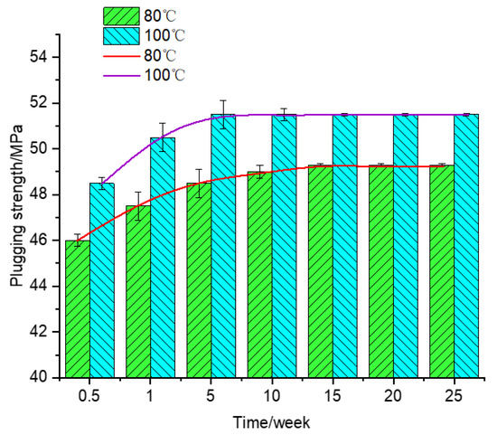 Figure 6 shows the plugging strength of the plugging agent changing with temperature and time. It can be found that the hydration reaction in the plugging agent continued within 15 weeks at 80 °C, the plugging strength of the plugging agent gradually increased within 15 weeks, and it tended to be stable from 15 weeks to 25 weeks. Similarly, it can be concluded that the hydration reaction of the plugging agent continued within 5 weeks at 100 °C, and the plugging strength reached a stable state after 5 weeks. As can be seen from the two curves in the figure, the plugging strength at 100 °C is higher than that at 80 °C. When temperatures get to 80 °C and 100 °C, the curing time reaches 5 weeks and 15 weeks, respectively, in this experimental data. The plugging strength does not change, and it can indicate the structure of the solidified body tends to be stable. These results show that in a high-temperature environment, the plugging strength does not decay but tends to be stable. It shows that the plugging agent has a superior plugging effect and improved the period of validity for field application.