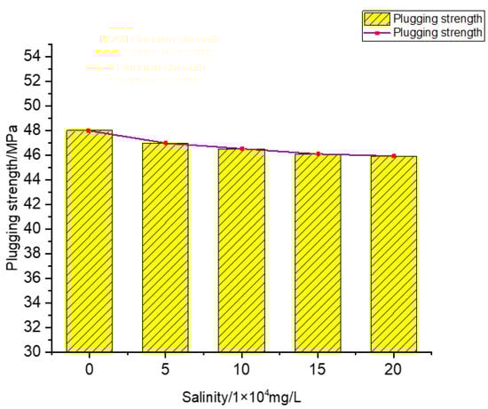 Salt resistance of plugging agent. The salt resistance of the plugging agent is shown in Figure 8. It can be seen that when the salinity of water was 0 mg/L, 5.0 × 104 mg/L, 1.0 × 105 mg/L, 1.5 × 105 mg/L and 2.0 × 105 mg/L, the corresponding plugging strength of the solidified body was 48 MPa, 47 MPa, 46.3 MPa, 46.1 MPa and 45.8 MPa, respectively, under the condition that the temperature was 100 °C. The experimental results show that there is little difference in plugging strength at different salinities. The strength variation is less than 3 MPa, which shows that the formation water with different salinities has little influence on the plugging strength of the plugging agent, showing favorable salt resistance.