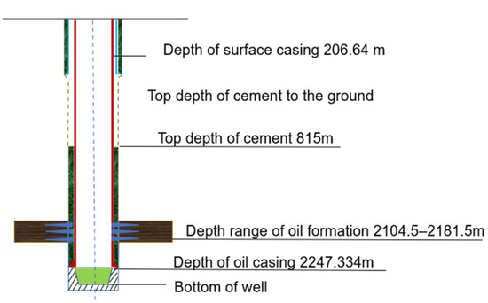 Taking well 1404 as an example, located in the Bai 21 well area of the Baikouquan Oilfield, Bai 59 Station, which was put into production on 1 November 2008. The drilling depth is 2256 m, twoopen well structure, as shown in Figure 9. The depth of the surface casing is 206.64 m, with the top depth of cement to the ground and the depth of the production casing being 2247.334 m, with the top depth of cement being 815 m. The range of production formation is 2104.5–2181.5 m, with a thickness of 77 m. In order to satisfy production requirements, the supplementary formation 2104.5–2123.0 m was subsequently perforated and produced. Then the phenomena of high liquid production and high water cut appeared in well 1404. The daily liquid production was 26.5 t, the daily oil production was 1.8 t, and the water content was 93.2%. According to the above data, it can be determined that the supplementary formation is the main water outlet layer. It is worth pointing out that the gel plugging agent used previously to solve the high water cut problems had failed to plug the well many times. The problems at the construction site were mainly the retention of the gel plugging agent near the wellbore and the bearing capacity after plugging. Therefore, the plugging agent we presented was used to plug 2104.5–2123.0 m to prepare for the next operation.