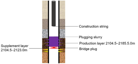 The construction technological process is shown in Figure 10. Pulled out the tubing, and made a wiper trip to the artificial well bottom to ensure the borehole operation channel opened during the construction procedure. The seal packer checking casing was installed at 2100 m, controlling the pressure at 18 MPa to check the qualification of the casing, and the casing was normal. Then, the electric cable bridge plug was installed to make sure the sealing between 2123 m and 2133 m was qualified. In order to prepare the plugging slurry used, subsequently, the formation absorption was tested. The absorption was 300 L/min when the pump pressure was 3 MPa. Therefore, the parameters for the plugging agent slurry used were 1.70–1.75 g/cm3, 9 m3, and a thickening time of 180 min at 50 °C. The depth of the working string sent to the wellbore was 1800 m, pumping in ahead fluid 4 m3, plugging agent slurry 9 m3, overflush fluid 6.5 m3 in turn with positive extrusion, and the plugging slurry level at this time was about 1883 m. Then, 2.2 m3 overflush fluid was pumped in with reverse extrusion, and the plugging slurry level at this time was about 2070 m. Shut in the well, and solidified 72 h under the shutoff pressure. The leakage formation was successfully plugged under the condition that the oilfield pressure test value was 30 MPa, which meets the production requirements.