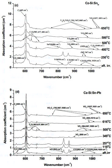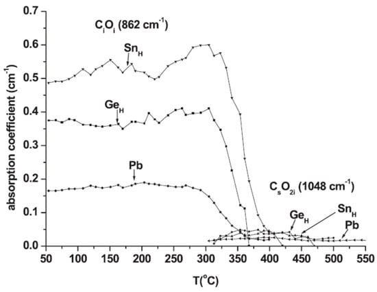 Figure 16 presents [] the IR spectra of Si for the S22 sample after irradiation and at certain characteristic temperatures in the course of isochronal anneals (data from Table 4). Sample S22 was a Cz–Si sample without any isovalent dopant and was irradiated at a fluence of 1 × 1018 cm−2. Signals from various O-related and C-related defects were present. From the latter family we shall focus mainly on CiOi (862, 739 cm−1) and CiCs (546 cm−1) defects. Signals from CsOi (585, 637, 684 cm−1) and CiOi (SiI) (936, 1020 cm−1) defects also appeared, as well as a band at 1048 cm−1 attributed to the CsO2i defect. Notably, Figure 16 was given to complete Figure 1b reporting respective spectra of isovalent-doped Si samples.