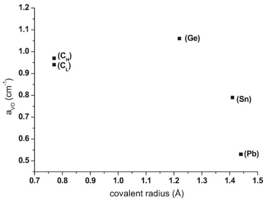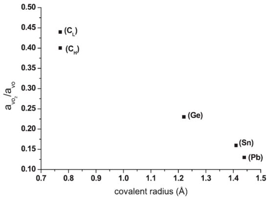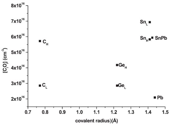 Figure 3 shows the production of the VO defect as a function of the isovalent dopant covalent radius. Information about the used samples is presented in Table 2. From Figure 3, taking the low carbon CL sample concentration as a base, we see that the sample doping with C and Ge results in an increase in the VO production, although doping with Sn and Pb results in a decrease in the VO concentration. More specifically, the following observations could be made.