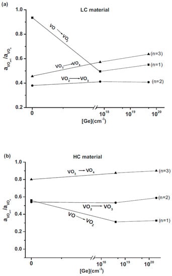 The conversion ratio (aVO2/aVO) of the VO to VO2 defect as a function of the Ge dopant concentration in the Si samples []. (a) Low concentration (LC) and (b) high concentration (HC) material. Reproduced with permission from []. American Institute of Physics, 2011.