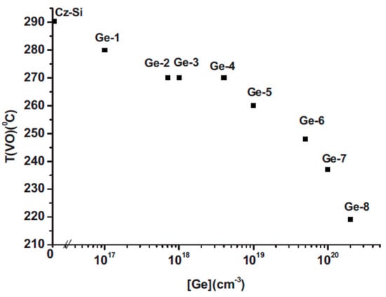 Figure 4 shows the conversion ratio (aVO2/aVO) of the VO to the VO2 defect as a function of the isovalent dopant covalent radius (information about the samples from Table 2). As seen in Figure 4, the larger the isovalent dopant radius, the smaller the conversion ratio. In other words, the formation of VO2 defects is more suppressed as the covalent radius of the isovalent dopant increases. This behavior could be explained [] as follows. The two main reactions that govern the annealing of the VO defect are: VO +Oi ➔ VO2 and VO + SiI ➔ Oi. Sources of the self-interstitials are large defect clusters [] formed in the irradiated material. As a result of the local strains induced in the Si lattice due to the substitutional incorporation of the larger radius isovalent dopants, the latter reaction is affected. It has been argued [] that the binding energy of the self-interstitials decreases as a result of the presence of the larger isovalent dopants. This makes the liberation of the self-interstitial from the defect clusters easier, facilitating their enhanced emission as the temperature increases in the course of annealing. It means that a larger number of VO pairs is dissociated due to the latter reaction, or an equivalently less VO participating in the former reaction. In other words, the formation of VO2 defects is suppressed. Thus, the larger isovalent radius, the smaller the VO2 formation. This is represented in Figure 4. Next, we shall study the production and evolution of the VO defect as a function of the Ge dopant concentration in Si.