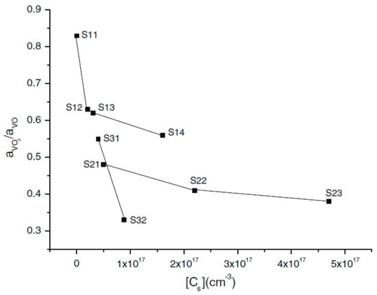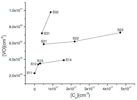 Figure 9 shows the production of the VO defect as a function of the Cs concentration of the samples (data from Table 4). It was observed that VO production increased as the C concentration of the samples increased. Three groups of samples irradiated with 2 MeV electrons, at three different fluencies, were used. The first group contained four samples of S1i (i = 1–4) irradiated at 5 × 1017 cm−2, the second group contained three samples of S2i (i = 1–3) irradiated at 1 × 1018 cm−2, and the third group contained two samples of S3i (i = 1–2) irradiated at 2 × 1018 cm−2. In the presence of C, there are three main reactions that take place in the Si lattice in the course of irradiation: V + SiI ➔ Ø (annihilation), V + O ➔ VO, and Cs + SiI ➔ Ci. The tendency of C to trap SiI’s leads to a decrease in the rate of annihilation of V, which enhances [] the number of available V to be captured by O atoms. In other words, the formation of VO defects is enhanced. This was observed in the three groups of samples irradiated with three different fluencies as illustrated in the three curves of Figure 9.