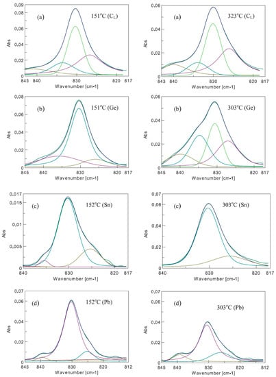Figure 11 displays the Lorentzian profiles of the IR spectra in the frequency range of the VO defect in the case of CL(a), Ge(b), Sn(c) and Pb(d) samples, respectively, (information about the samples from Table 2), for two characteristic temperatures of 151 and 323 °C. As seen from Figure 11, in addition to the 830 cm−1 band of VO pair, bands at ~826 and ~839 cm−1 which were attributed [,] to the V2O and V3O centers, respectively, could be separated in the profiles. The band at ~835 cm−1, also noted in the Lorentzian profiles, is probably related with the VmOn structure, but its exact identity is not known. Notably, V2O and V3O defects at 10 K have [,] IR bands at 833 and 842 cm−1, respectively.