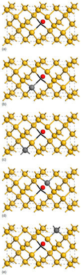 In our previous work, DFT calculations were employed to calculate the relative energetics of the A-center and its interaction with isovalent dopants. Figure 13a illustrates the VO that is essentially formed from the binding of an Oi atom next to V in Si (binding energy −1.32 to 1.57 eV, [] and references therein). In the vicinity of an isovalent dopant, VO pairs preferentially bind at nearest neighbor positions (Figure 13b,d) as compared with next nearest neighbor positions (Figure 13c,e). The binding energy gain of the isovalent atom in nearest neighbor position to the vacancy (in the VO) is considerably higher due to the strong binding (mainly relaxation) of the dopant atoms (particularly due to the relaxation of oversized atoms such Sn and Pb) to the vacant site []. The DFT results show that the incorporation of isovalent dopants in Si led to the formation of DVO or DOV clusters. These formed as they reduced the repulsive NN interactions of the isovalent atoms with the oxygen interstitials [].