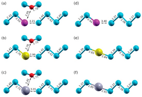 The isovalent dopant—VO interactions along the (10-1) direction: (a) GeVO, (b) SnVO, (c) PbVO, (d) GeV, (e) SnV, and (f) PbV. Larger spheres represent the isovalent dopant, blue spheres the Si atoms, and red spheres the Oi atoms. All the distances are in Å. Reprinted with permission from the PCCP Owner Societies, [].