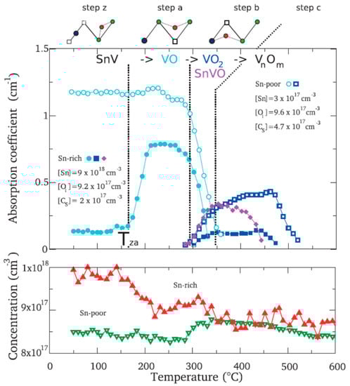 The thermal evolution of the A-center, VO2, and SnVO defects for samples with Sn-poor content and Sn-rich content. The constituent defects are sketched using red circles for the oxygen atoms, blue and green circles for the D and Si atoms, respectively. The square and dotted square represent the V and semi-vacancies. The thermal evolutions of the Oi for Sn-poor and Sn-rich concentrations are given at the bottom of the figure Reprinted with permission from []. American Institute of Physics, 2011.