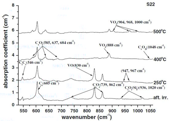 IR spectra of the S22 sample after irradiation and at characteristic temperatures in the course of the isochronal anneals. Reproduced with permission from [].