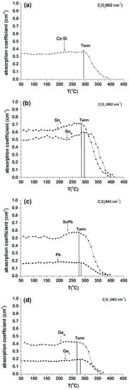 Figure 21 shows the respective evolutions of the CiCs defect for the same pairs of isovalent doped samples (data from Table 6) as Figure 20. Prior to comparing the annealing characteristics of CiOi and CiCs centers, a comment for the latter is needed. The CiCs anneals out at around 350 °C. No signal arises in the IR spectra upon the disappearance of the CiCs defect. It is important to note that the thermal annealing of the dicarbon center is uncertain [,] and is not completely understood. Although destruction is the main annealing mechanism, photoluminescence (PL) studies [] have shown that the dicarbon center may also capture a mobile atom to form another center responsible for the 7686 cm−1 line growing in the PL spectra as the G line of the CiCs center decay. The origin of the latter line is not certain [].