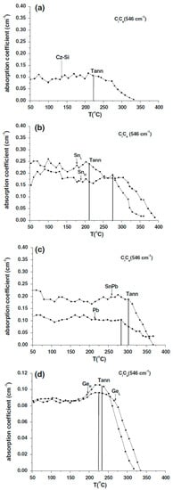 IR spectra of the Ge-8 sample (a), after irradiation at a fluence of 5 × 1017 cm−2, and the Cz-Si:Pb (b), Cz-Si:SnH (c), and Cz–Si:SnPb (d) samples, after irradiation at a fluence of 1 × 1018 cm−2, at characteristic temperatures of the isochronal anneal sequence. Reproduced with permission from [,]. American Institute of Physics.