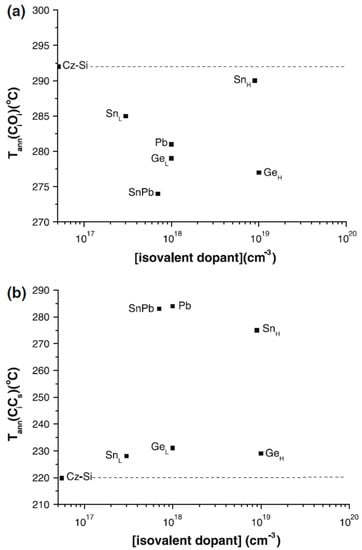 The concentrations of Ge, Sn, and Pb-doped samples, as well as the concentrations of the Oi and Cs of the used samples in Figure 3 [].