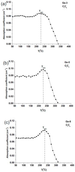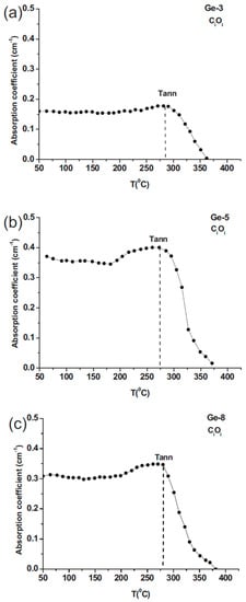 Figure 7 and Figure 8 show the characteristic temperatures Tann of the VO annealing and Tform of the VO2 formation as a function of the Ge concentration (information about the samples from Table 3). It was observed that the annealing temperature Tann of VO (Figure 7) and the consequent formation temperature Tform of VO2 (Figure 8) decreased as the Ge concentration in the samples increased. The phenomenon can be explained as follows. In Ge-doped Si, the reaction VO + SiI ➔ Oi involved in the VO annealing is enhanced []. Indeed, the presence of Ge facilitates the emission of SiI’s from loosely bound self-interstitial clusters. This promotes an earlier onset of VO annealing’ that is, the earlier annealing of the VO defect is mainly due to the reaction VO + SiI ➔ Oi, which is activated earlier in the Si lattice due to the Ge presence. The larger the Ge concentration the earlier the onset of the VO annealing. Regarding the now earlier growth of the VO2 defect in the spectra, the following explanation can be offered []. It is established [,] that divacancies V2, which also form during irradiation, can partly anneal out by dissociation (V2➔V +V) in the temperature range 250–300 °C, releasing isolated vacancies. These vacancies are mobile at the above temperatures, and it is very likely that they encounter Oi atoms released from the reaction VO + SiI ➔ Oi to form VO pairs. These VO atoms can be responsible for the enhanced formation of VO2 defects forming when the mobile VO pairs are captured by isolated oxygen atoms. The activation of this scheme of reactions could finally explain the growth of VO2 defects at earlier temperatures. Additionally, we argued [] previously that Ge atoms act as a temporary trap for vacancies. This trapping and release of V by Ge helps them to survive longer in the lattice, thus increasing the possibility of encountering oxygen atoms and being captured by them. This, in turn, could lead to the formation of VO2 defects at lower temperatures.